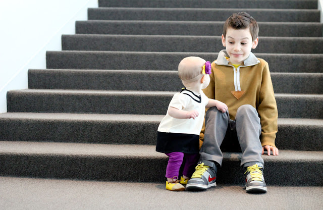 This is so cute! I love the whole outfit you made for Owen, and I adore Natalie's shoes and cardigan. I love the pictures of Nat peeking from behind Owen's leg, and them looking around the corner at each other. That is SO sweet! =)