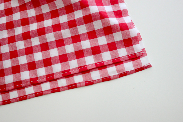 a. Fold the short sides of the apron under 1/4″ twice, encasing the raw edge. Press in place and then top stitch.