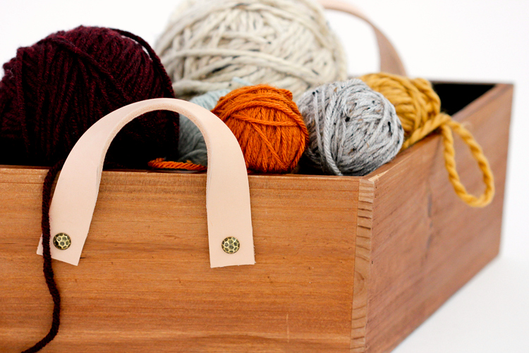 Placing one end of one of the straps against the side of the basket, hammer in an upholstery tack through the leather and into the wood box. Hammer gently at first as the tack will bend if you go at it too aggressively. It takes a while, but keep hammering until it pierces through the leather, and then you can hammer harder. You may pre-punch a small hole in the leather first if desired.